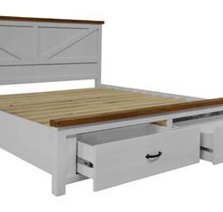 CONSTRUCTION Structural Frame: Solid Pine Handles: Metal Black Antique Colour: White with Pine Coloured Tops SPECIFICATIONS King Storage Bed W197x D219 x H120 CM Queen Storage Bed W167x D219 x H120 CM
