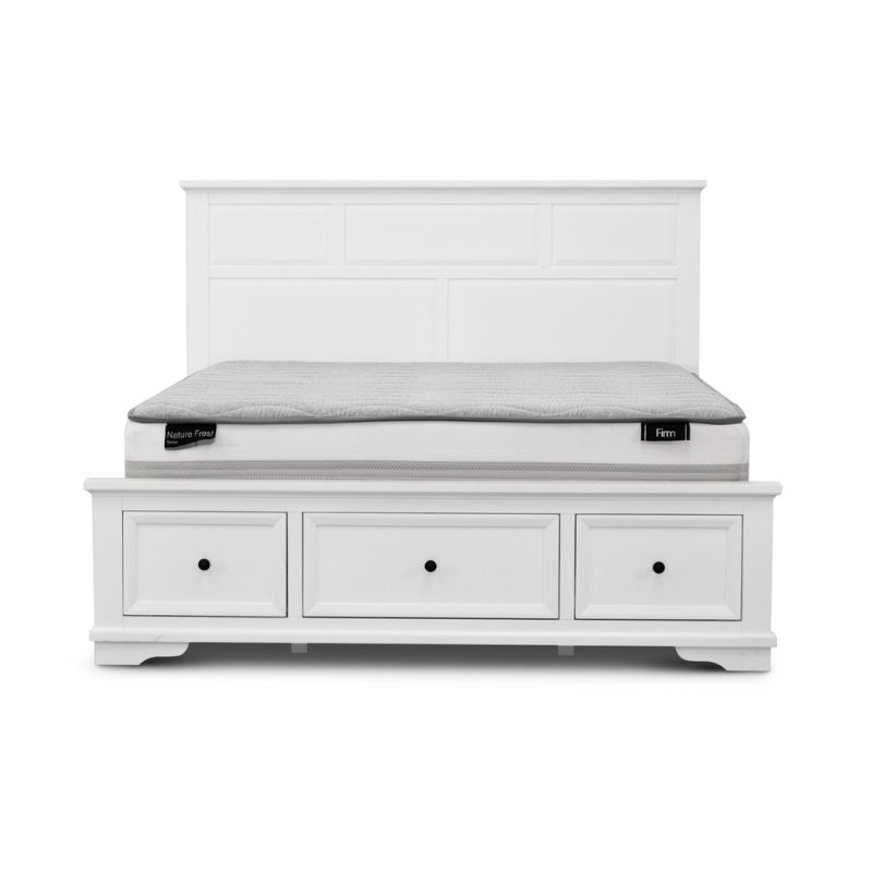 CONSTRUCTION Structural Frame: Acacia (Pine), MDF Timber Colour: White painted DIMENSIONS Queen Bed with Storage at Footboard: W215 x D167 x H120 CM King Bed with Storage at Footboard: W215 x D197 x H120 CM WARRANTY: 2 years