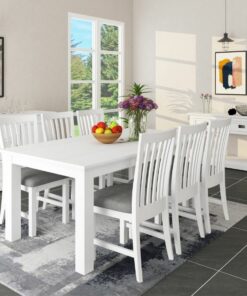 CONSTRUCTION Structural Frame: Acacia/MDF Handles: Metal Seat pads: Fabric Colour: Vivid White Finish: Brushed Made in Vietnam DIMENSIONS 180CM Dining Table: W180 x D100x H77CM Dining Chair: W46 x D57x H99CM 220CM Dining Table: W220 x D100 x H77CM