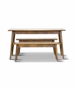 CONSTRUCTION Structural Frame: Mango Wood Colour: Light Oak Made in India DIMENSIONS 150CM Bench: W150 x D45 x H45 CM 180CM Dining Table: W180 x D90 x H76.5 CM 150CM Dining Table: W150 x D90 x H76.5 CM 120CM Bench: W120 x D45 x H45 CM