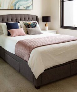 CONSTRUCTION Structural Frame: MDF & Particle Board Fabric Upholstered: Polyester Foam: Foam Density 20 Colour: Stone | Dark Grey Feet: Rubberwood Made in Malaysia DIMENSIONS Queen Bed: W169 x D224.5 x H126.7 CM Double Bed: W154 x D223.5 x H126.7 CM King Bed: W199 x D224.5 x H126.7 CM