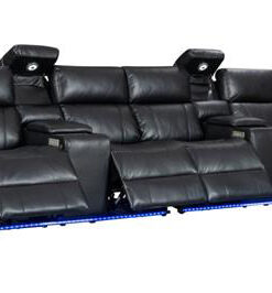 Regent Home Theatre Lounge: The Regent Home Theatre Lounge offers the ultimate entertainment experience with four power reclining seats (2 for seat and 2 for headrest). Upholstered in black leather, it features a console, reading light, light tape, storage arm, AC plug, and USB ports for added convenience. Designed for comfort and functionality, this lounge is perfect for creating a luxurious home theatre setup. Material: Black Leather Dimension: 169W X 94D X 103H cm 169W X 94D X 103H cm